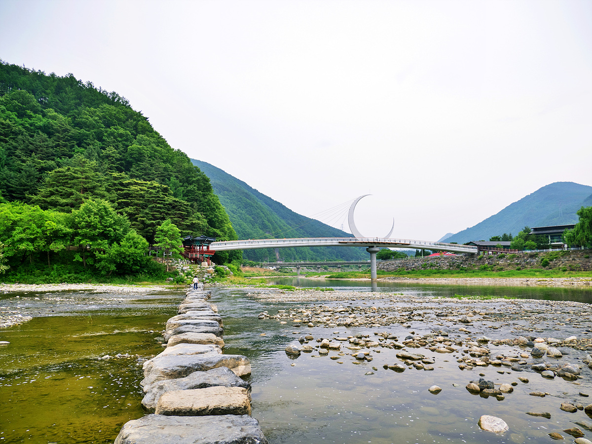 징검다리를 건너고 아래쪽에 있는 돌다리를 건너 돌아가면 된다.