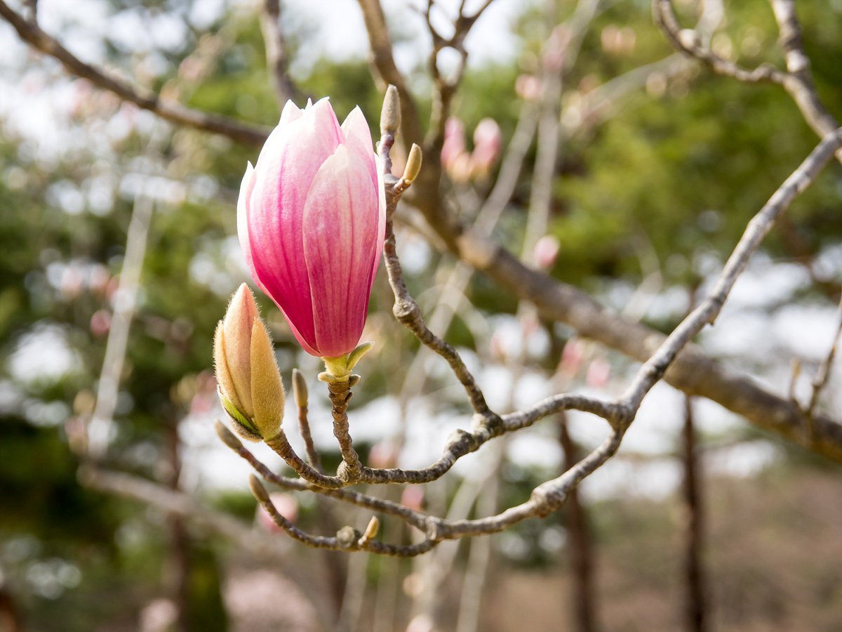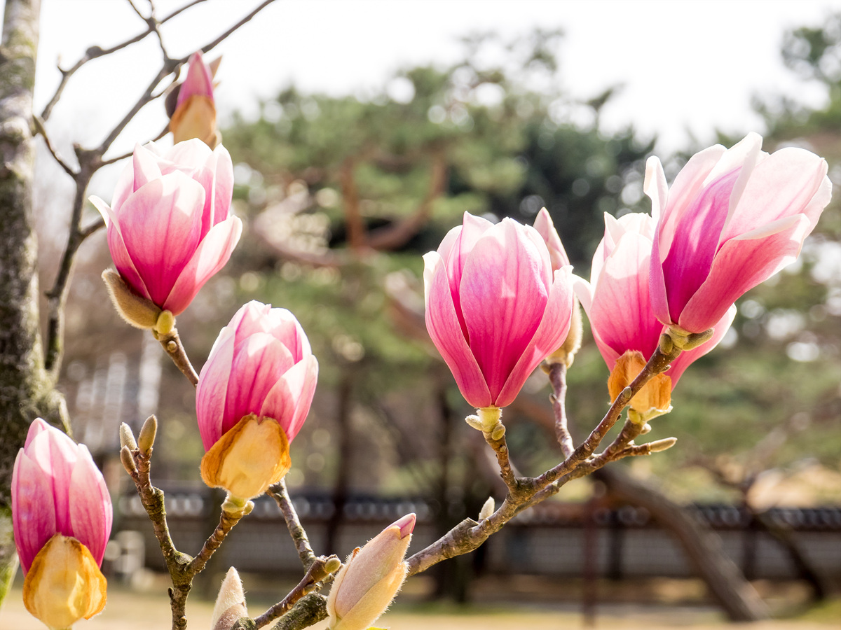 현충사는 봄에 목련과 홍매화가 유명하다.