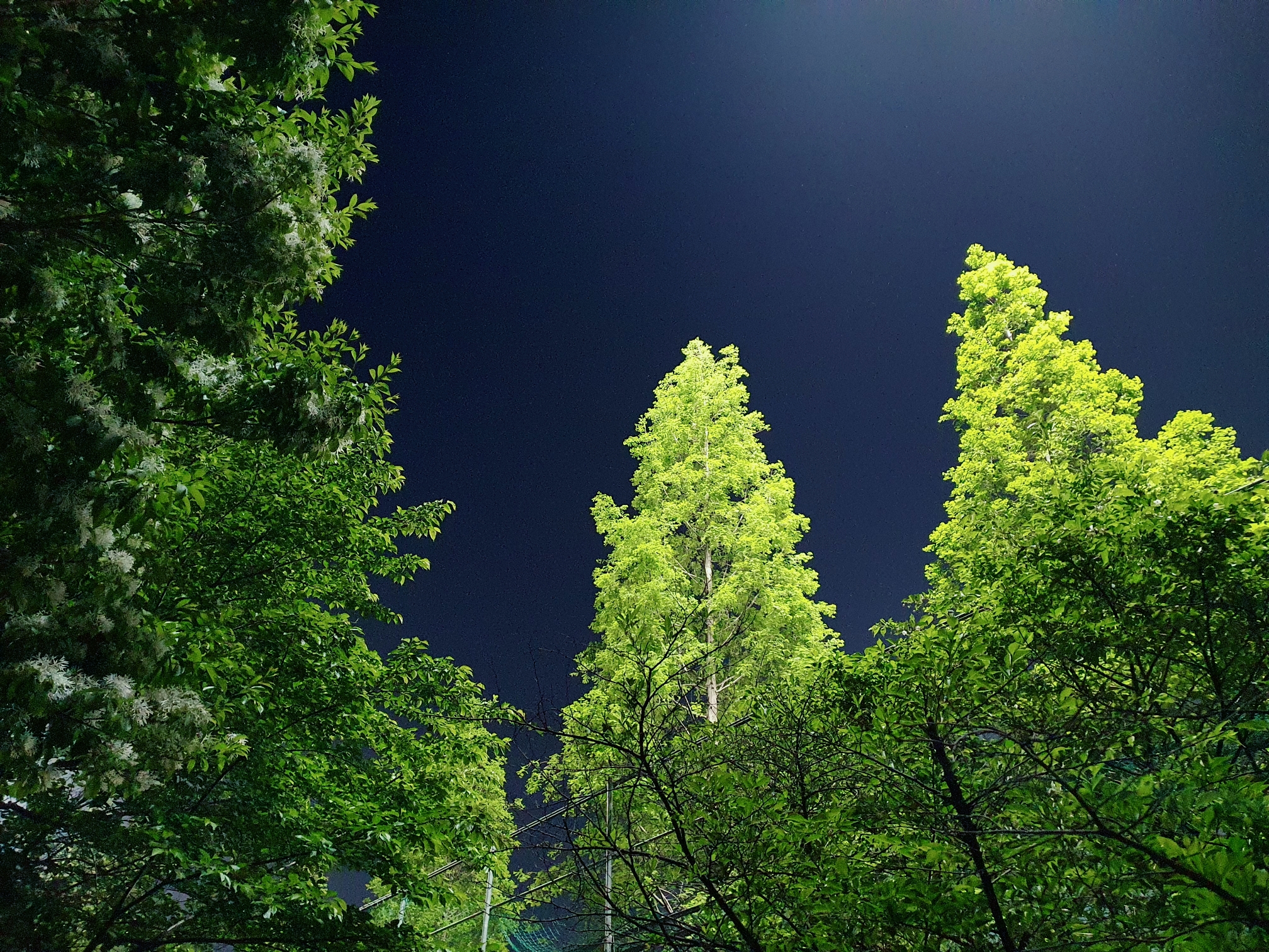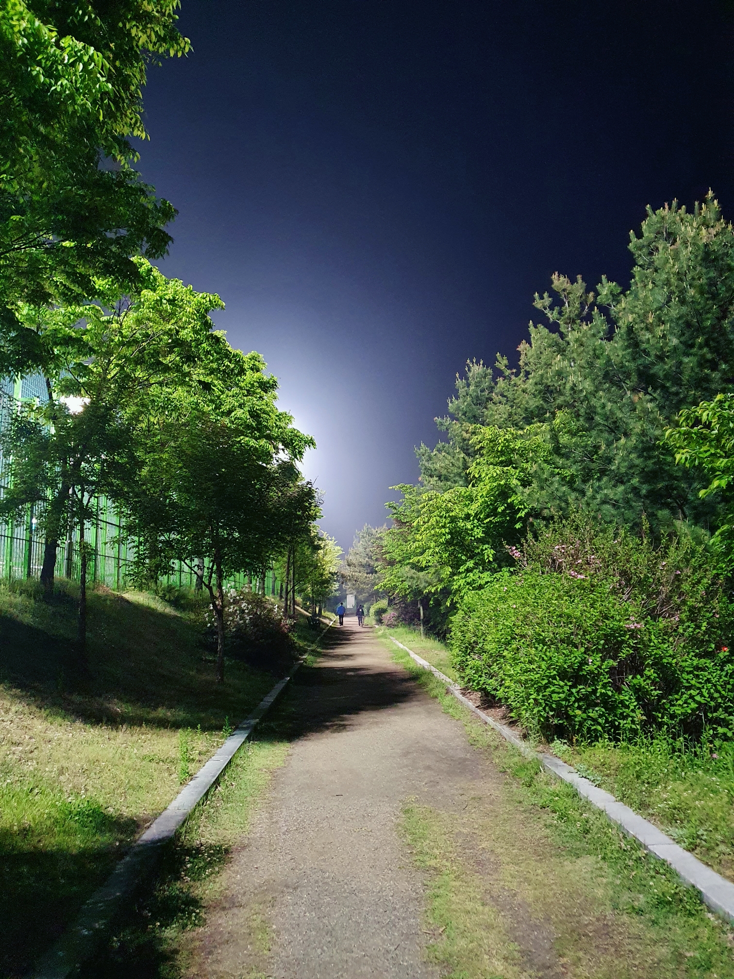 저녁 식사를 너무 배부리게 해서 운동을 하러 나갔다. 비 온후의 밤하늘과 가로등 아래 초록잎이 너무 예뻐서 사진을 찍어 봤다.