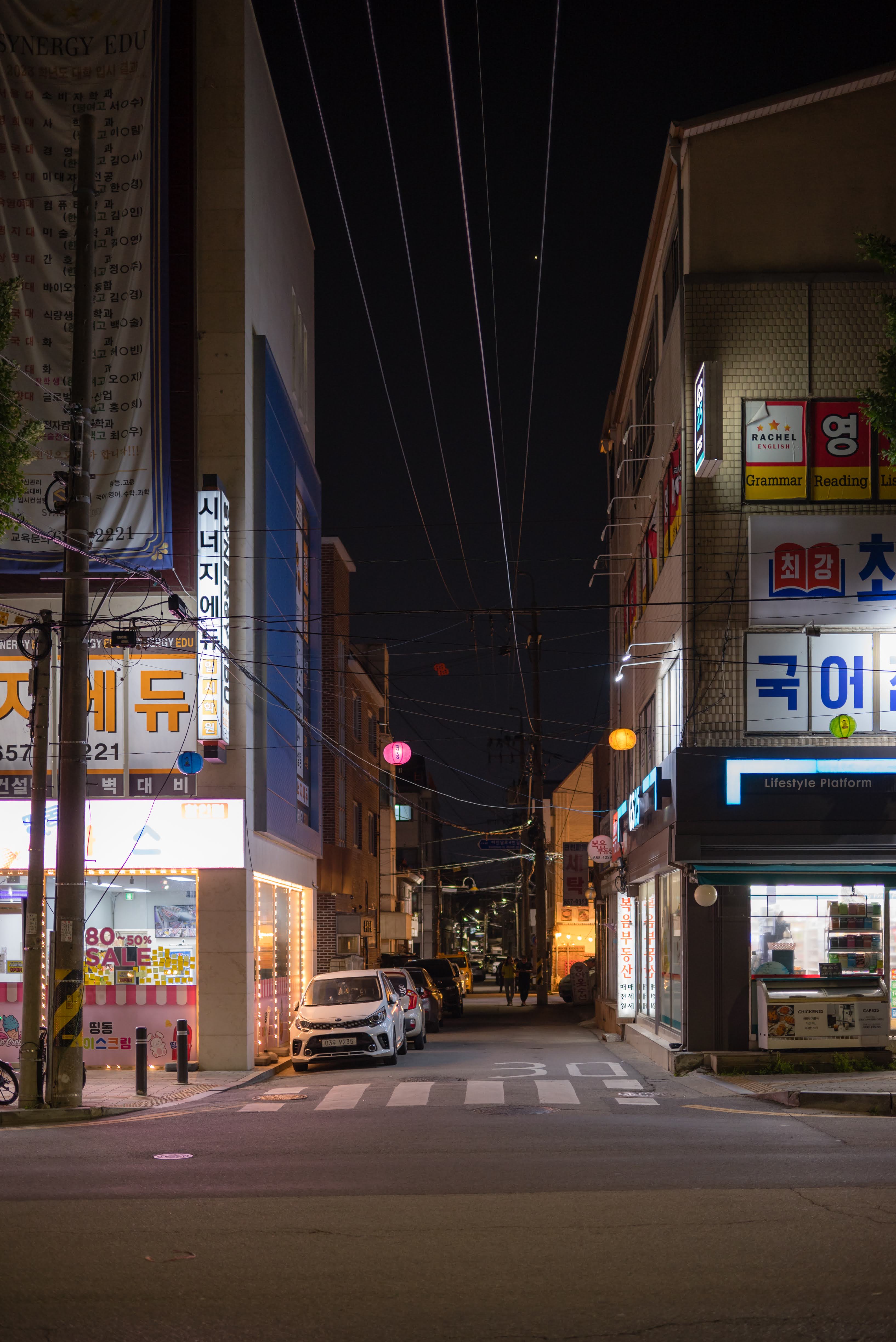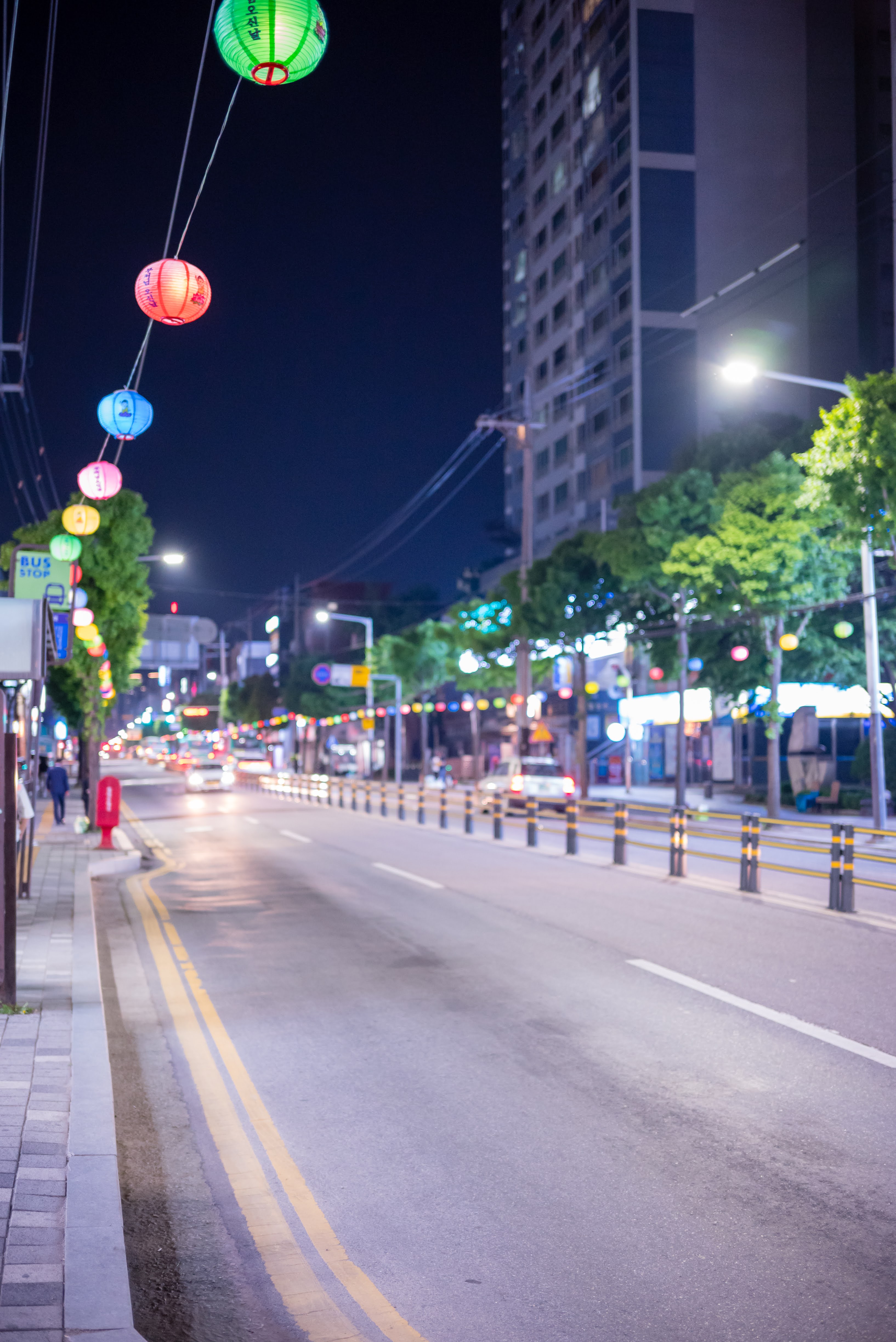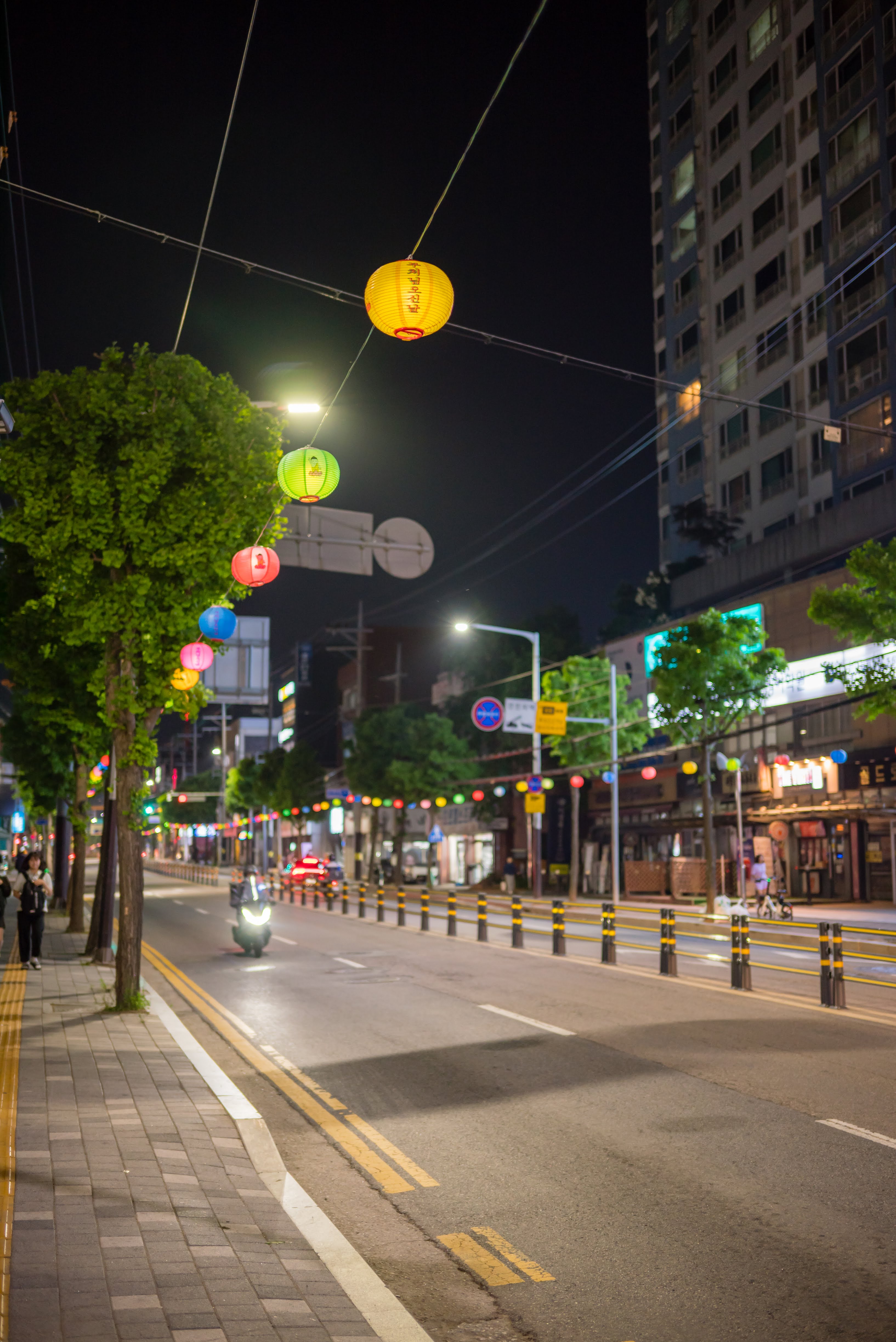 밝게 빛나는 가로등과 연꽃 등이 매달려 있는 길가가 예쁘다.