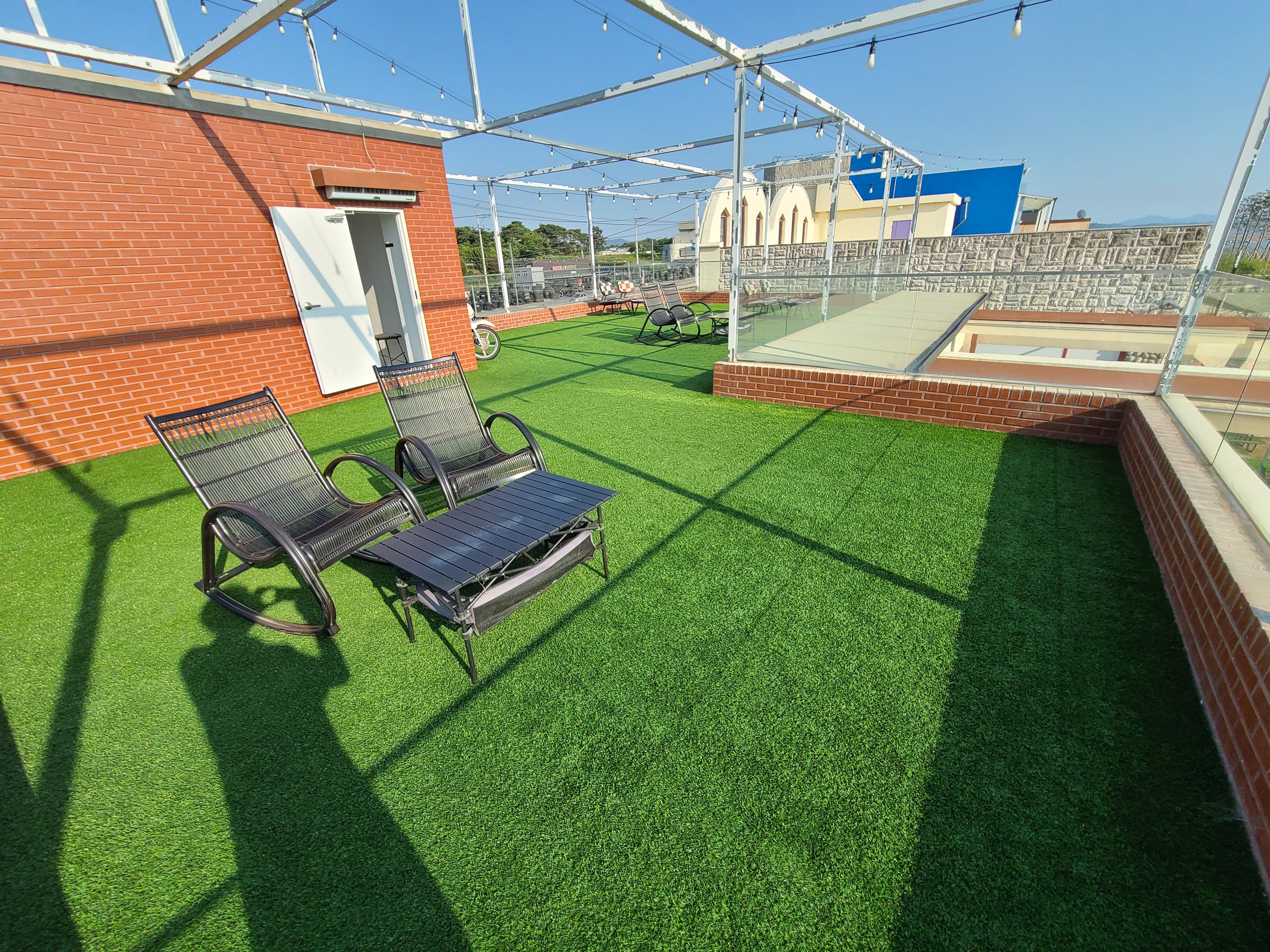 반은 지붕으로 덮여 있고 반은 개방되어 있다.