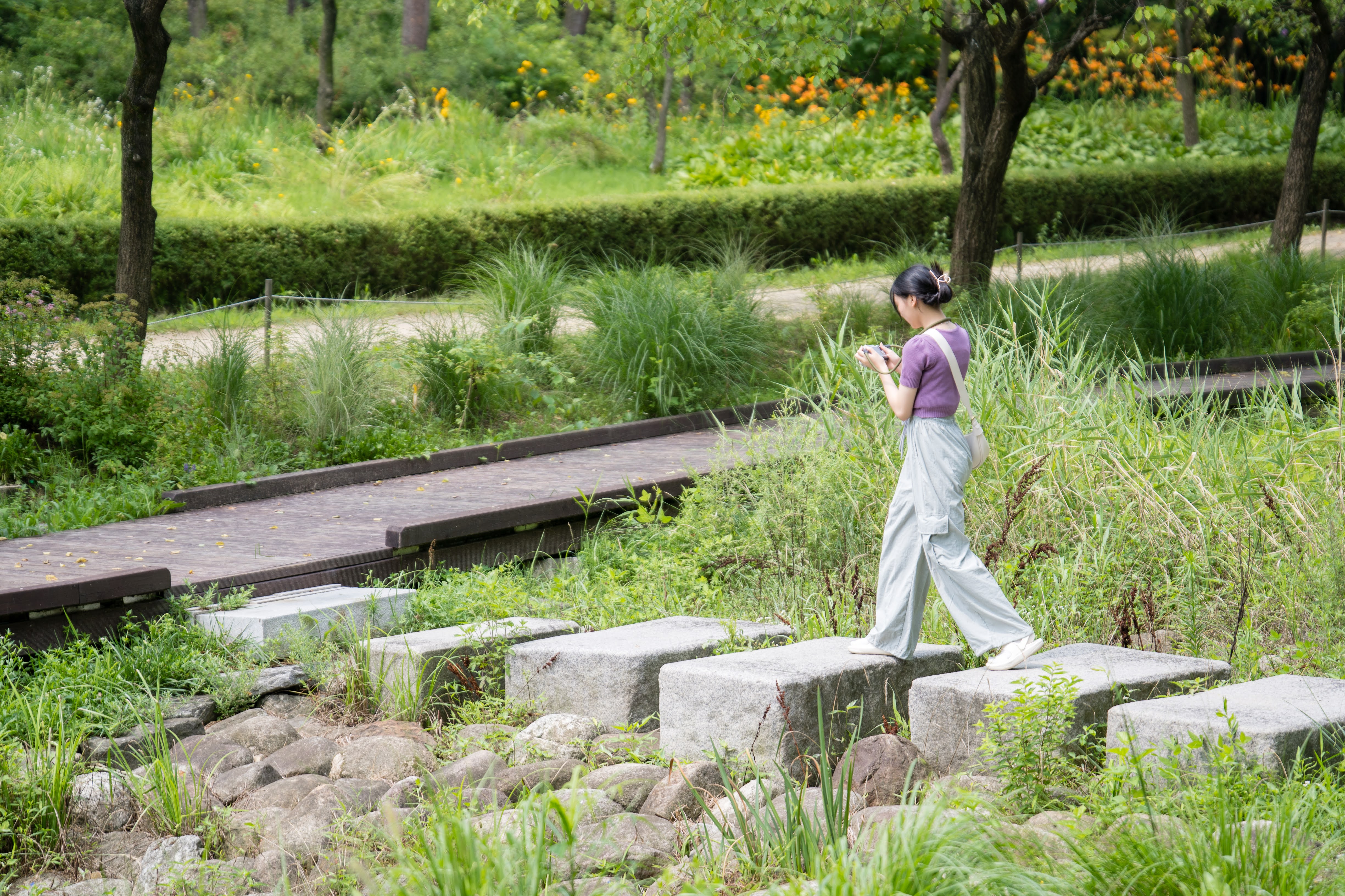 징검다리가 있지만 물이 흐르지 않아 시원한 감은 없다.