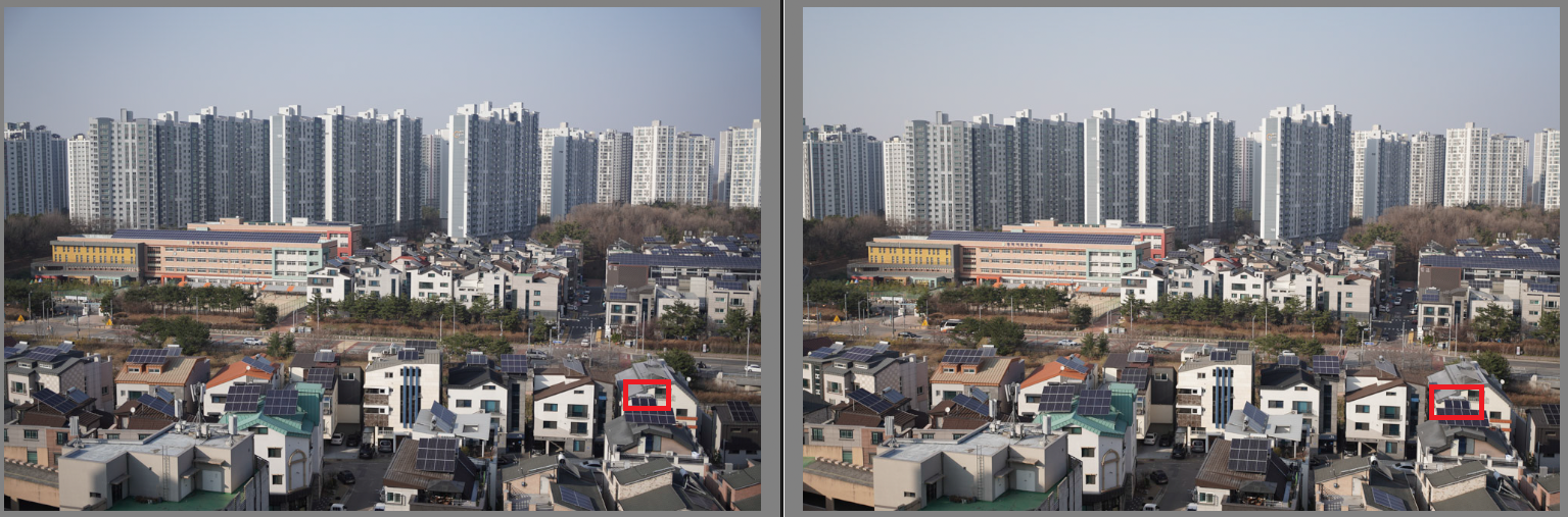 위의 붉은 박스 영역을 확대한 결과이다. "강남태양열" 글자를 보면 확실히 VILTROX가 선명하다.