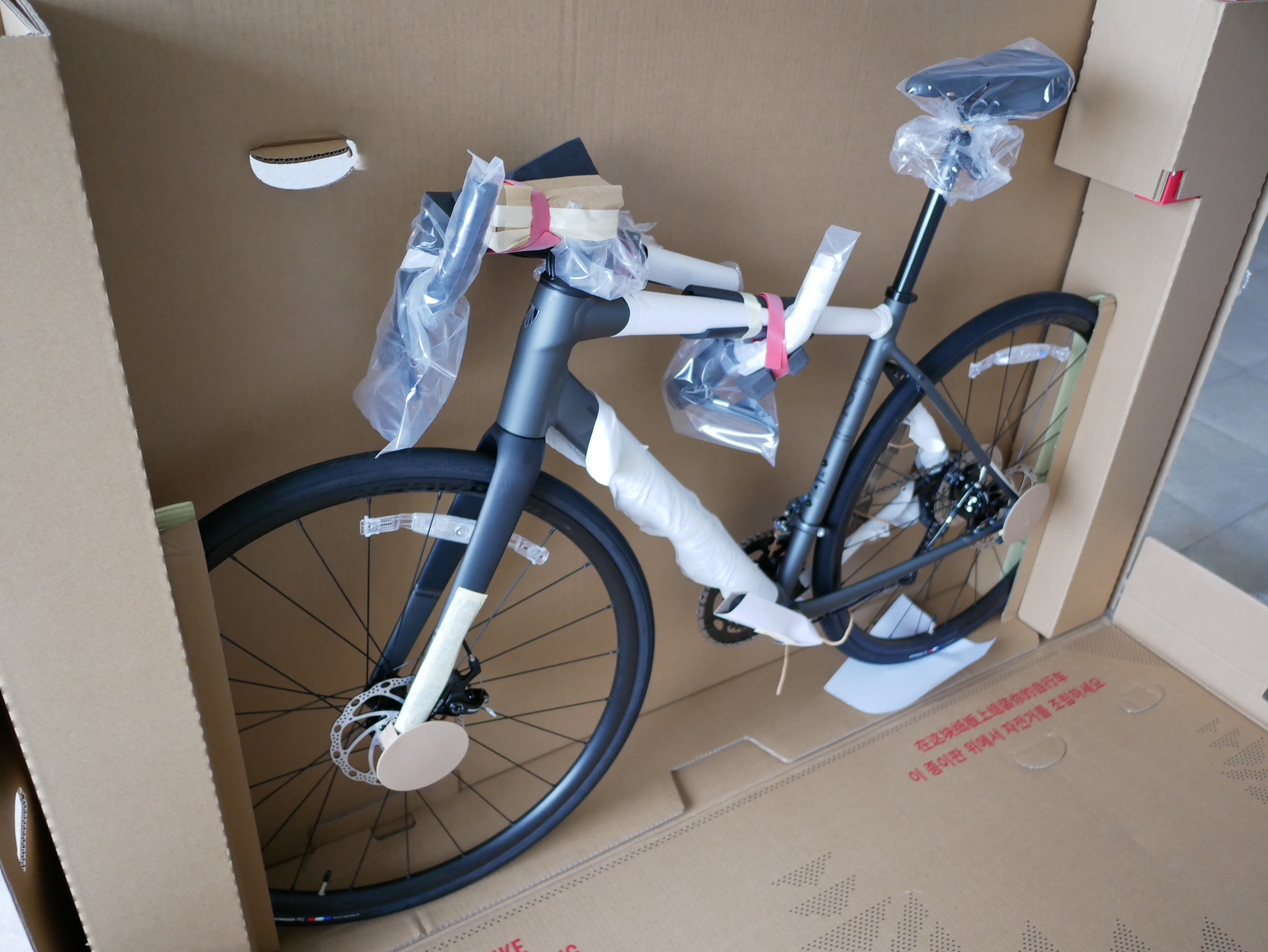 그러면 아래 사진처럼 박스가 열리고 자전거를 뺄 수 있다. 동영상과 달리 안장과 앞 바퀴 등 모두 조립이 되어져 있다.
